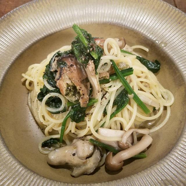 燻製した牡蠣とほうれん草のアーリオオーリオ