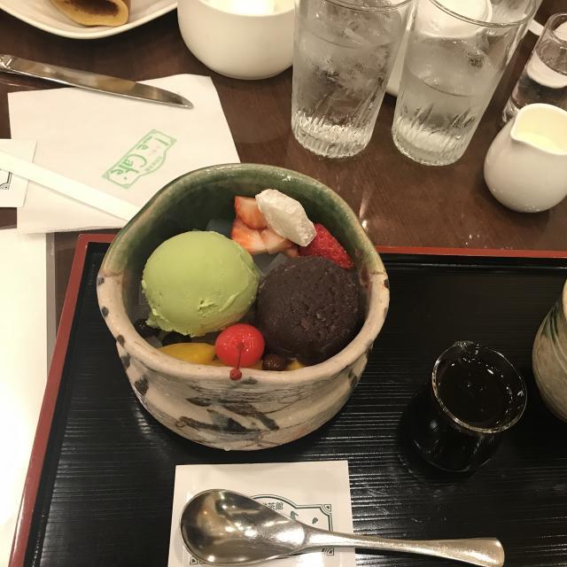 抹茶アイスクリームと餡、季節のフルーツ、寒天をコクのある黒蜜で楽しめます。